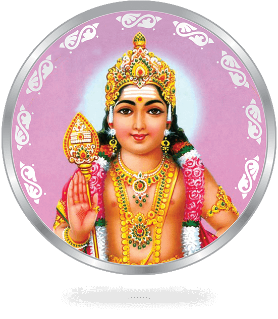 This silver coin features a colorful image of Lord Kartikeya, who is the Hindu god of war, on the front and a colorful image of his spear on the back.