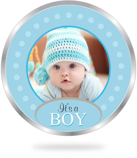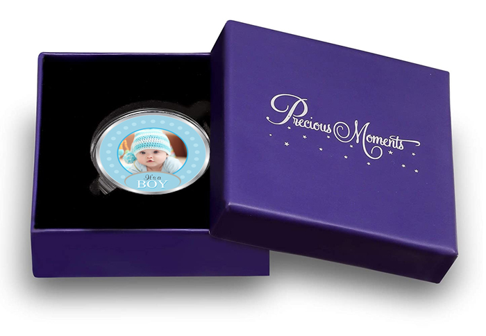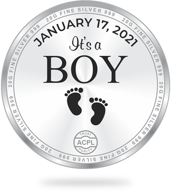 This personalized coin's obverse design features a colourful illustration of a personalised image of a newborn baby boy with the inscription "It's a BOY". The back side of the coin portrays footprints, "It's a BOY" inscription with the personalised birth date of the little one and ACPL's traditional 'Trust and Purity' mintmark.