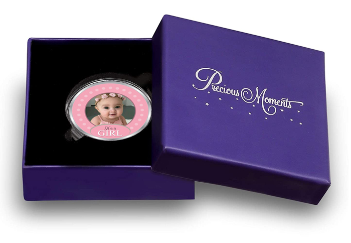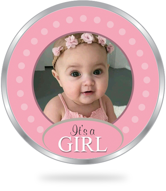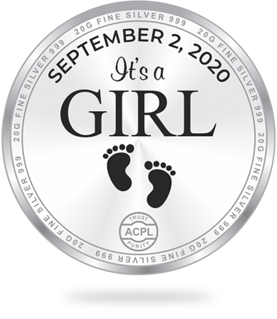 This personalized coin's obverse design features a colourful illustration of a personalised image of newborn baby girl with the inscription "It's a GIRL". The back side of the coin portrays footprints along with "It's a GIRL" inscription with the personalised birth date of the little one and ACPL's traditional 'Trust and Purity' mintmark.