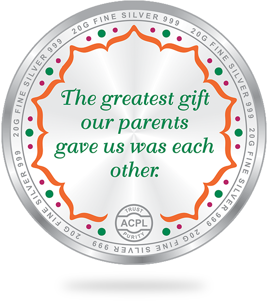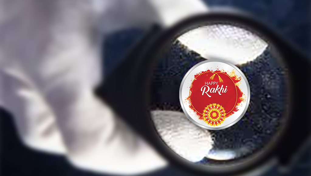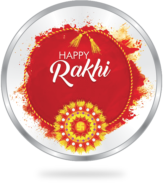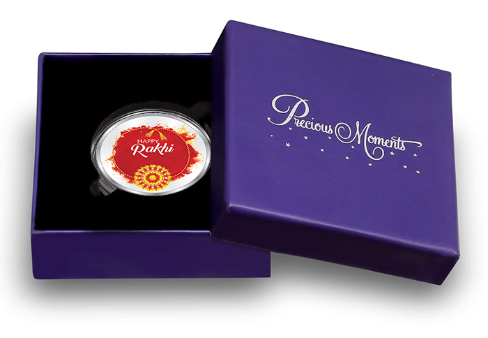 The "Happy Raksha Bandhan (Rakhi)" silver coin features the image of a colourful Rakhi on the front, and a sweet message for your brother or sister on the back.