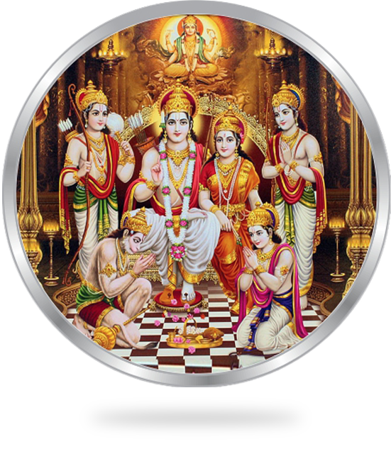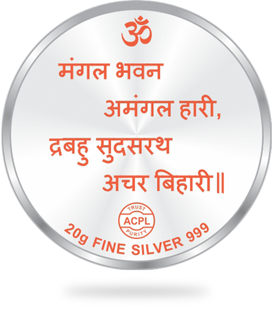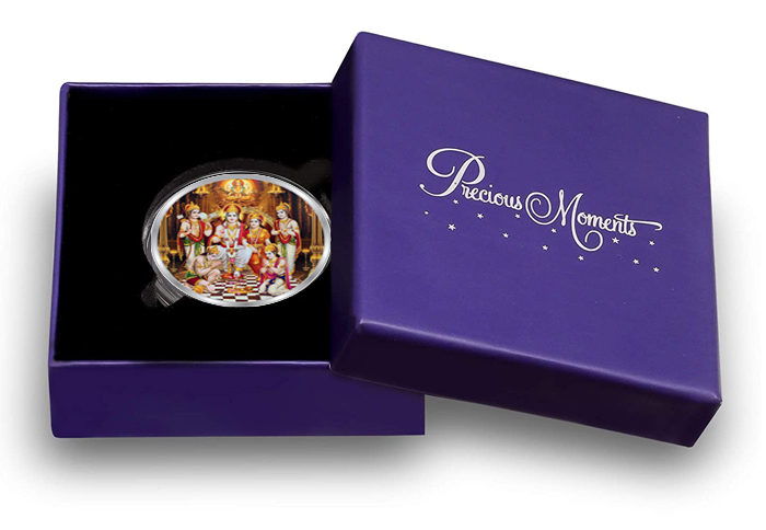 This silver coin features a colorful depiction of "Ram Darbar", which includes Lord Ram, his wife Goddess Sita, his younger brother Lord Lakshman, and his dedicated devotee Lord Hanuman, and an excerpt from the bhajan "Mangal bhavan amangal haari" by Sant Tulsidas.